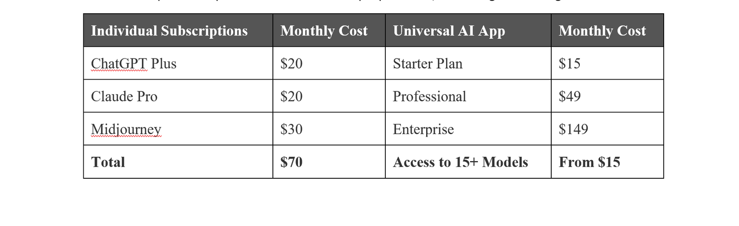 Universal AI App costs are drastically reduced due to the integrated approach of Unified approach. Most customers are saving 40-60% on their old subscription stack. For businesses and power users that would otherwise require enterprise-level access to multiple platforms, the savings are even greater.